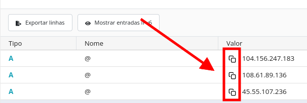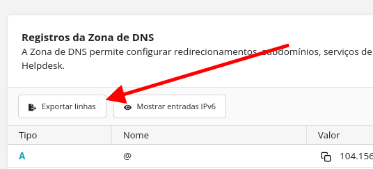 É possível exportar de forma geral a tabela de DNS do domínio selecionado, para isso basta usar a opção: Exportar linhas