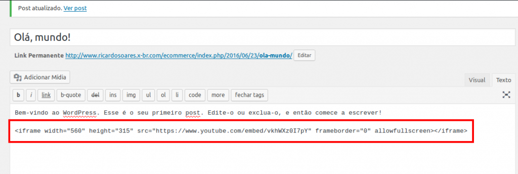 - Acesse a página de seu site em que deseja colocar o vídeo. Mude a edição do conteúdo para modo TEXTO no canto direito superior da área de edição. Cole o código no campo de texto. Depois disso atualize a página;